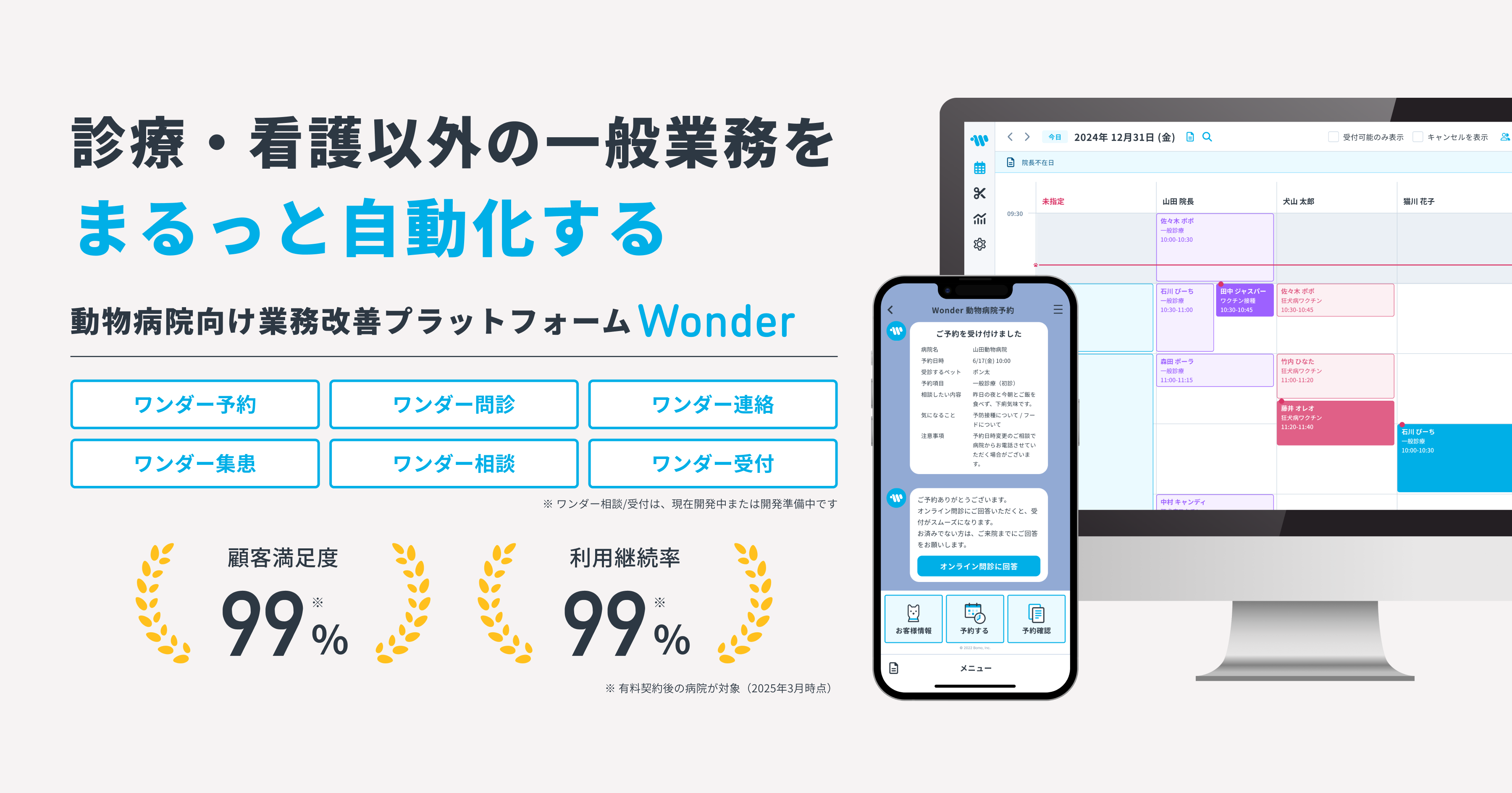 Wonderは動物医療DXを推進する予約管理システムです。